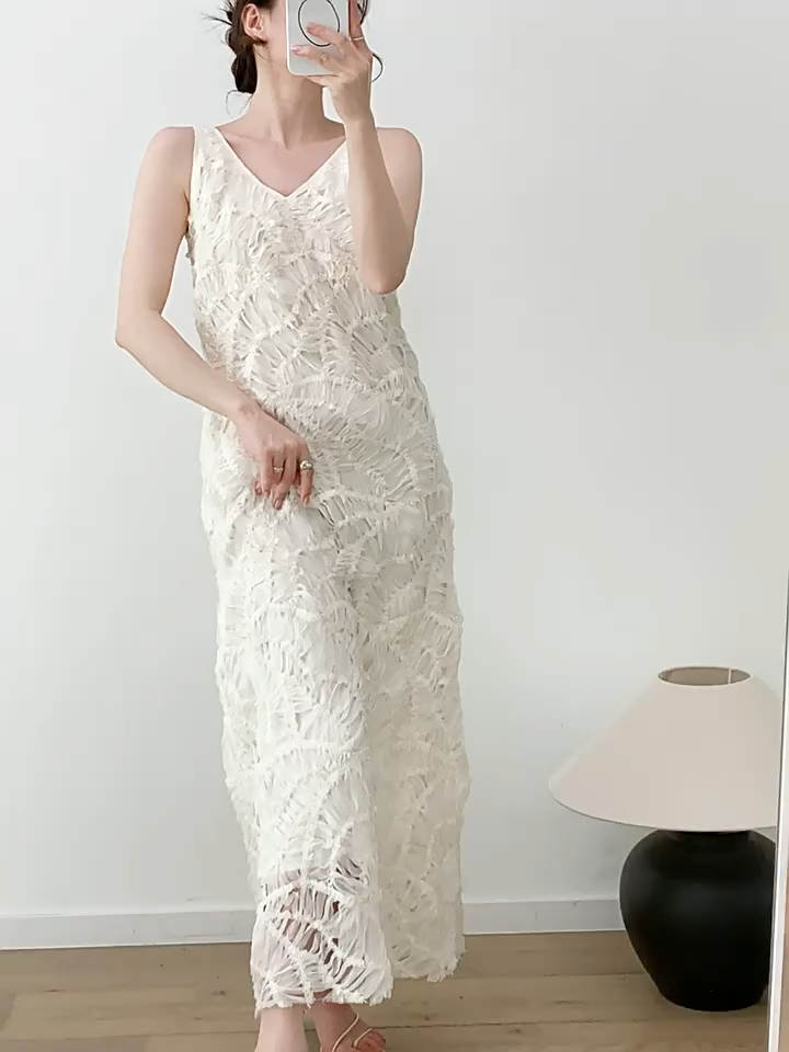 This V-neck lace maxi dress showcases exquisite craftsmanship and a graceful silhouette. Designed with elaborate petal-like detailing and delicate lace fabric, it exudes a soft, feminine charm. The sleeveless spaghetti strap design enhances the neckline while the flowing maxi length adds an air of elegance. Its intricate lace texture creates a luxurious, high-quality feel while the V-neckline elongates the figure for a sophisticated look. This dress moves beautifully with every step, embodying both romance and modern elegance.