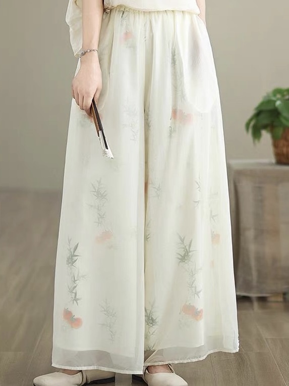 Fang Ning Sheer Wide Leg Pants with Oriental Printing