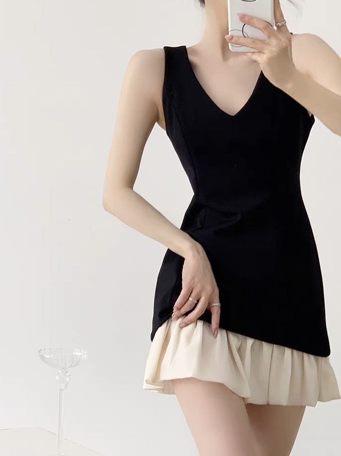 Featuring a striking black and white color-block design, it offers a bold yet elegant aesthetic. The flattering V-neckline and sleeveless cut make it a versatile piece. Delicate ruffle trim adds a playful touch, elevating the classic design to something truly special. Perfect blend of modern design and feminine flair.