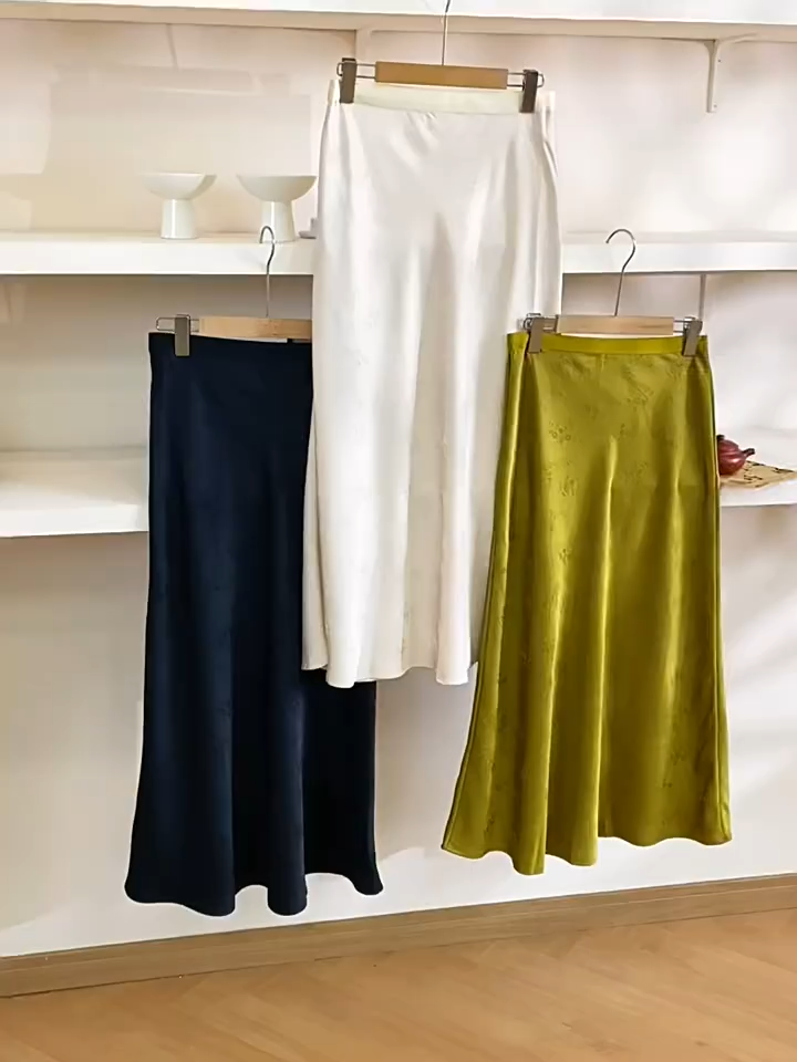 Designed for women who appreciate refined textures and timeless femininity. Crafted from luxurious satin with floral embroidery, this skirt features a beautiful embossed pattern that adds depth and sophistication to every movement. The elastic waistband ensures comfort while enhancing the waistline, and the fluid drape creates a graceful, flattering silhouette. Ideal for ladies who love floral embossed details and flowy elegance.