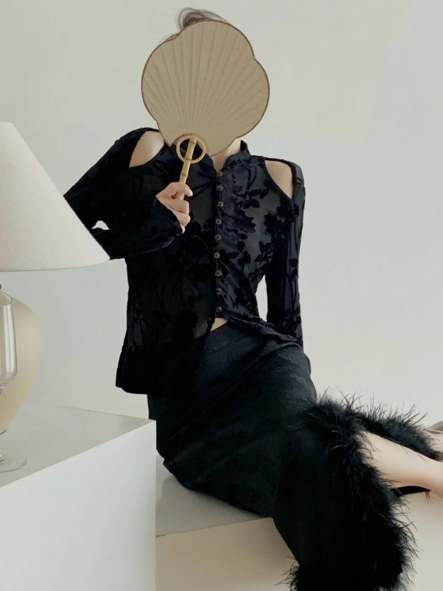 The Ling Yun Feather Trim Jacquard Oriental Skirt is a bold fusion of elegance and artistic flair. Crafted from rich jacquard fabric in classic black, this skirt features a delicate floral pattern that adds depth and sophistication. A soft feather trim at the hemline brings a touch of drama and movement, turning a traditional silhouette into a striking statement piece. Whether paired with a fitted blouse or styled for evening wear, this skirt embodies the perfect balance of heritage and high fashion.