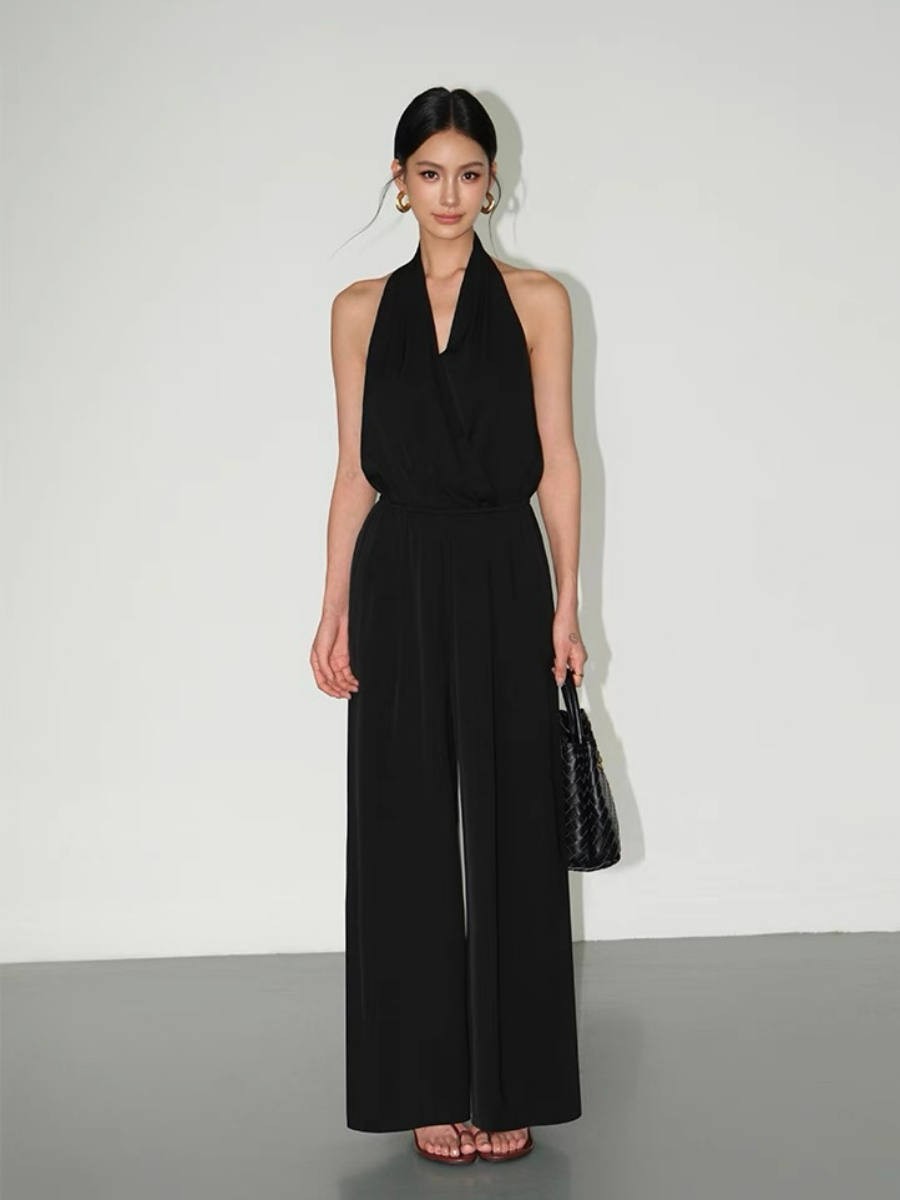 Designed for the modern woman who values both elegance and edge. Featuring a flattering V-neckline and chic halter neck design, this sleeveless jumpsuit enhances the shoulders and collarbone while offering a sleek, feminine silhouette. The waist-cinching cut sculpts your figure beautifully and the subtle open-back detail adds just the right touch of allure. This one-piece delivers the drama of a dress with the comfort and confidence of a tailored jumpsuit.