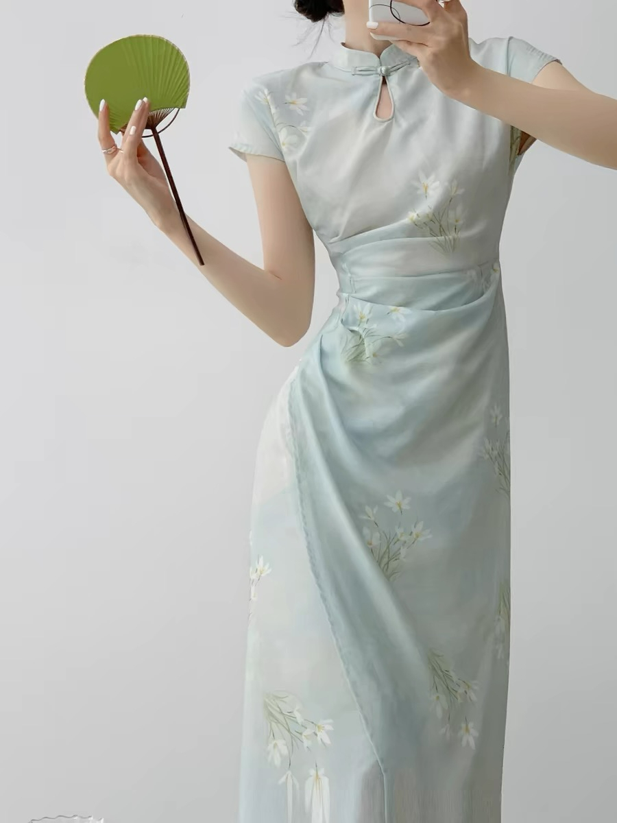 The Xi Fan Light Floral Front Slit Cheongsam is a modern reinterpretation of classic Chinese elegance. Designed with delicate light green floral patterns, this dress exudes a fresh, feminine charm perfect for both daytime gatherings and elegant evening affairs. The thoughtfully crafted pleated waist design enhances the silhouette, offering a flattering fit that highlights the natural curves while maintaining comfort.